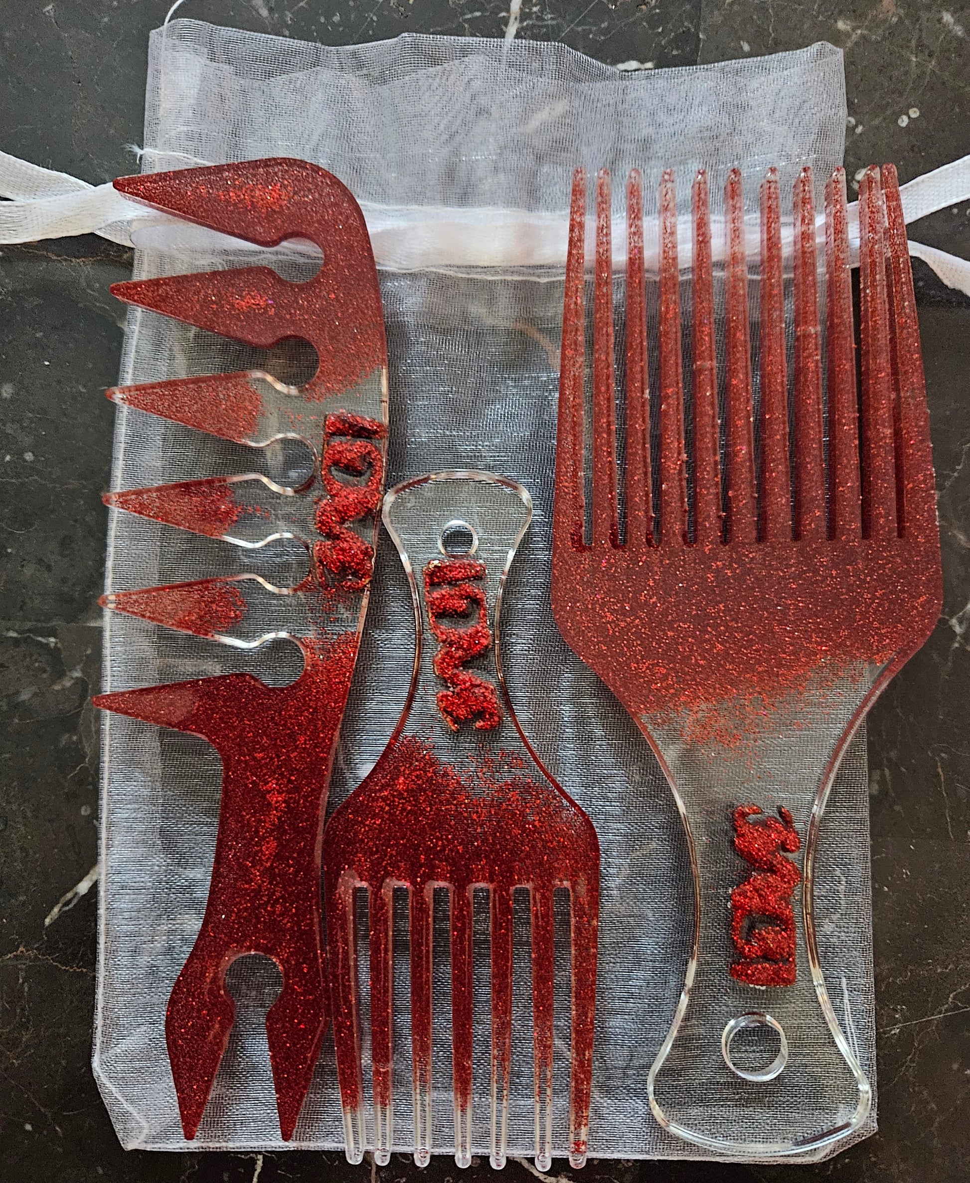 This is a 3-piece comb set. Made of Epoxy Resin. Clear/Red Glitter with the word "Love".