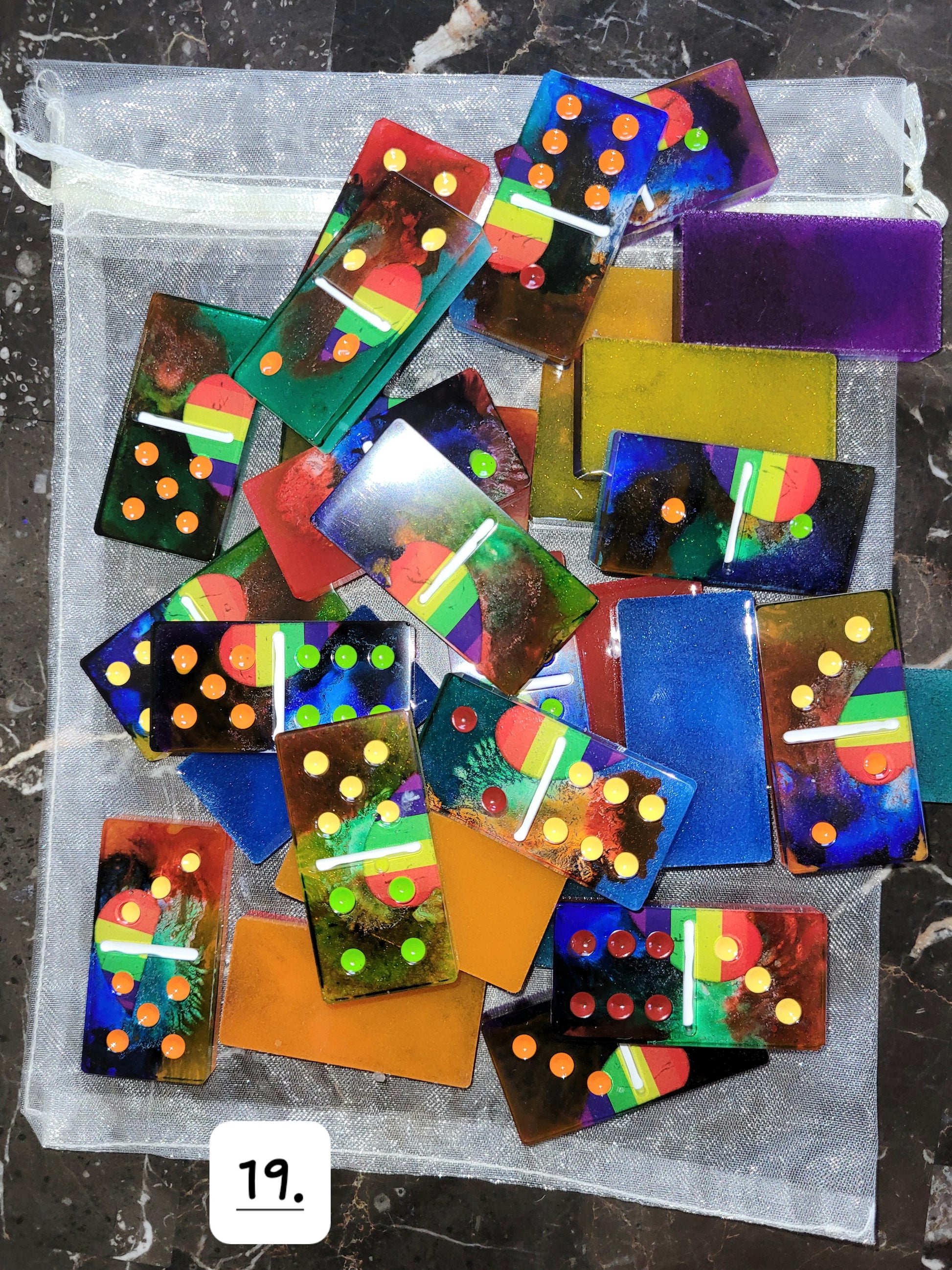 This is a standard set of epoxy resin Dominos. Green/Red/Orange/Yellow/Blue/Purple