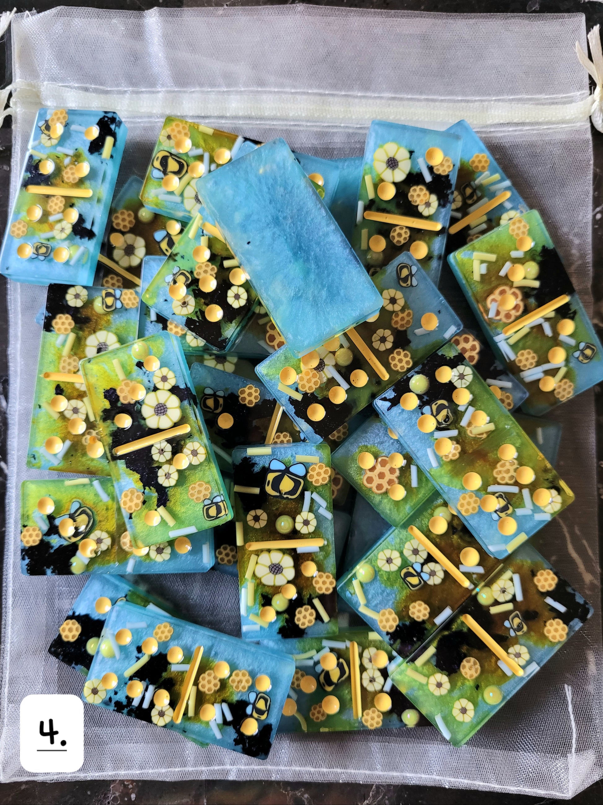 This is a standard set of epoxy resin Dominos. Sky Blue/Yellow/Black
