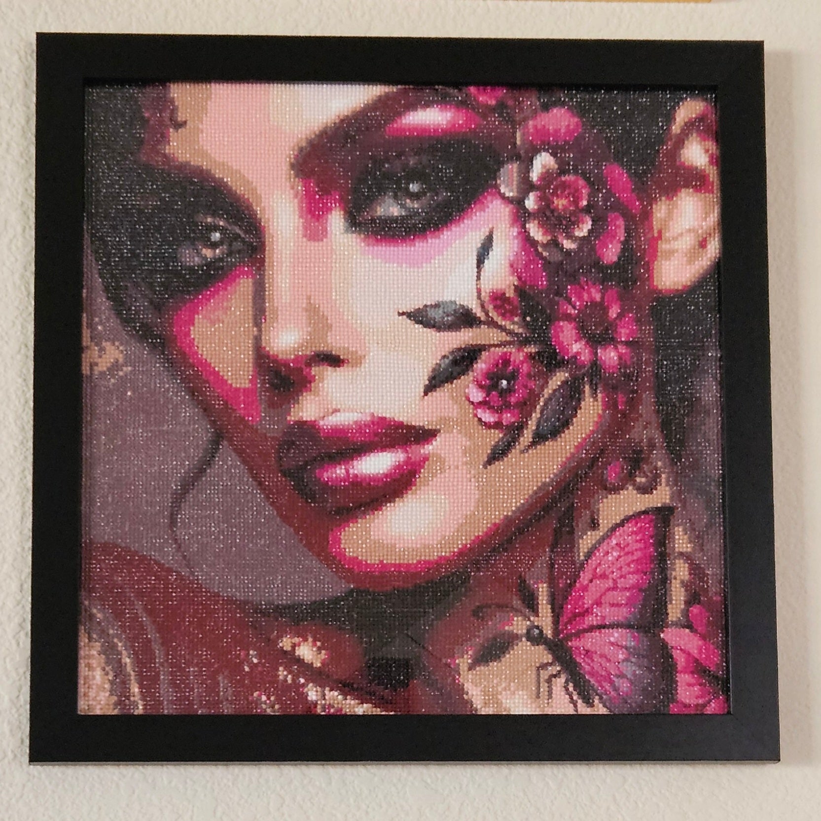 Each stone has been individually placed and sealed to the canvas. Canvas comes framed as shown and with hardware to hang.